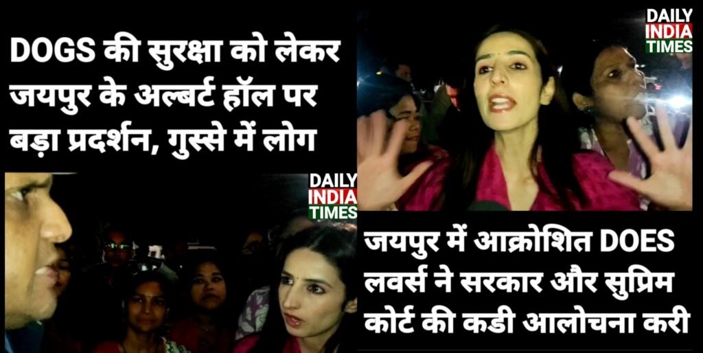 राजधानी जयपुर के अल्बर्ट हॉल पर सरकार और सुप्रिम कोर्ट के DOGS को लेकर दिए गए फैसले के खिलाफ बड़ा प्रदर्शन किया गया जिसमें बड़ी तादाद में लोगों की उपस्थिति रही, अपने आक्रोश को व्यक्त करते हुए अनेक लोगों ने DOGS को लेकर गंभीर चिंता करते हुए कहा कि आतंकियों द्वारा खुलेआम लोगों को मारा जा रहा, बलात्कार हो रहे हैं लेकिन सरकार अपराधियों पर एक्शन लेने की बजाय बेजुबान DOGS को मार रही है .
